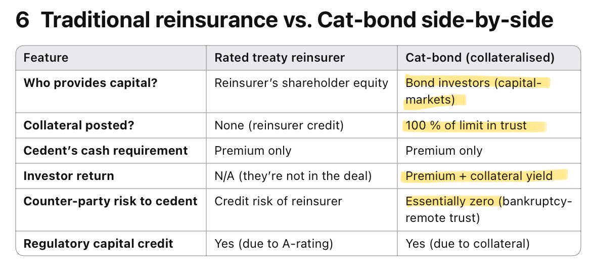 Catastrophe bonds (cat bonds) work by having an investor pool deposit 100% of collateral and earn βrisk free rate + premium paid by the insured