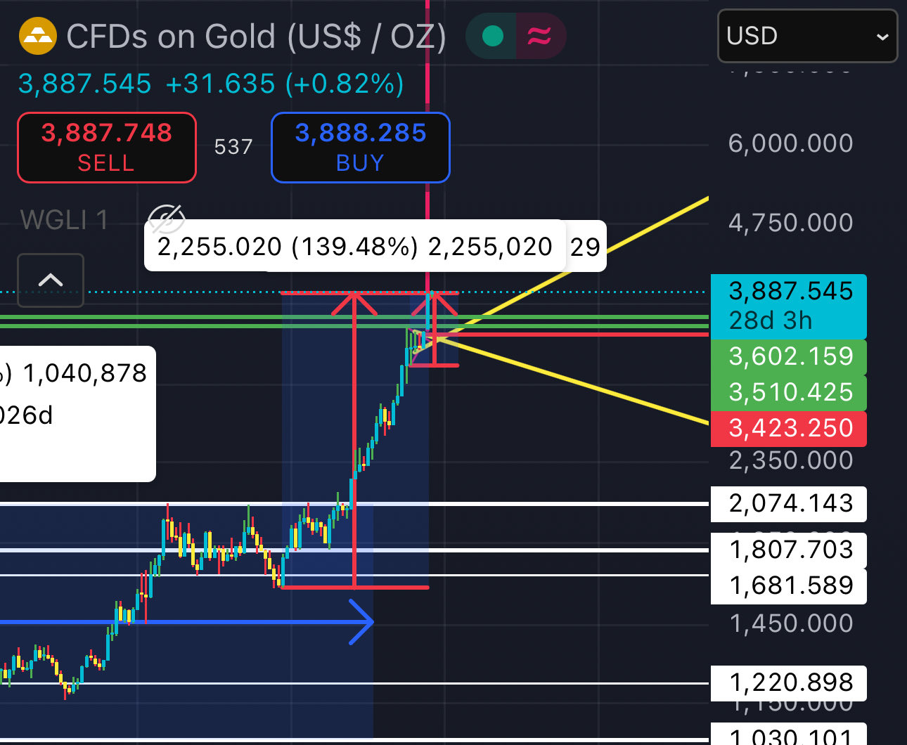 we are approaching a local top for silver and gold according to my market vibe meter usually i'd write a longer post with an explanation & technicals, but today i'm writing of off vibes ๐ my twitter/x feed has been filled with so much euphoria regarding silver & gold that it starts to resemble those accounts which constantly promote Bitcoin you also have to contextualize how extended gold and silver's moves have been. the graph shows monthly candles this isn't a bearish post on gold though - still expecting $4000/oz in November 2025 ๐