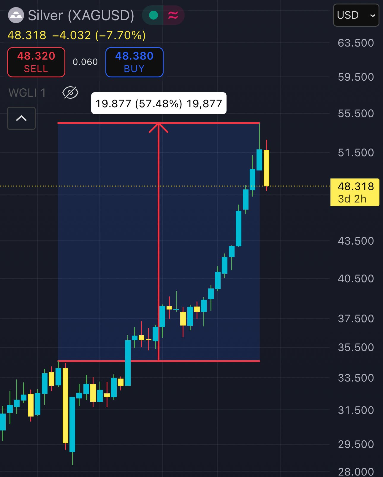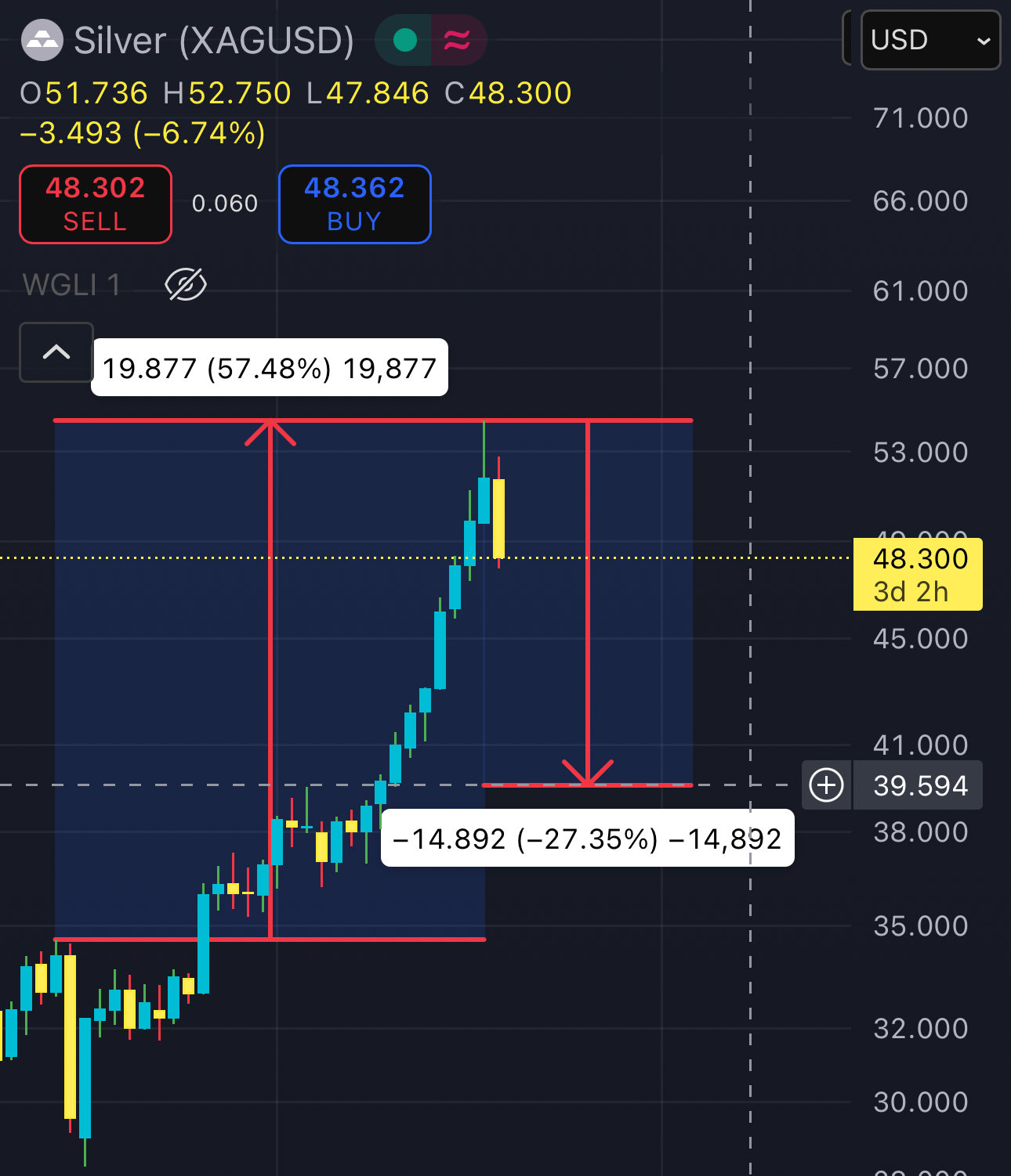 silver could pullback to ≈$40 before continuing its uptrend this represents a ≈27% correction from the top this is the lowest possible bottom for this move - it probably won't go this low. if it does, the move will happen fast, so have your buy limit orders ready. next week is FOMC interest rate decision. the Fed will cut the rates by another 25bps, and other things equal - it's positive price pressure for silver if the price breaks below $47, it will likely fall closer to $45. expect a stronger support in the $43-45 area overall, any prices in the vicinity of September 15th 2025 prices is a GREAT buying opportunity * keep in mind the total 75 bps interest rate cut by the Fed this year is already in progress of being priced in - the market doesn't wait for the official announcement. this is one of the reasons why you had so much upside price volatility in the last month