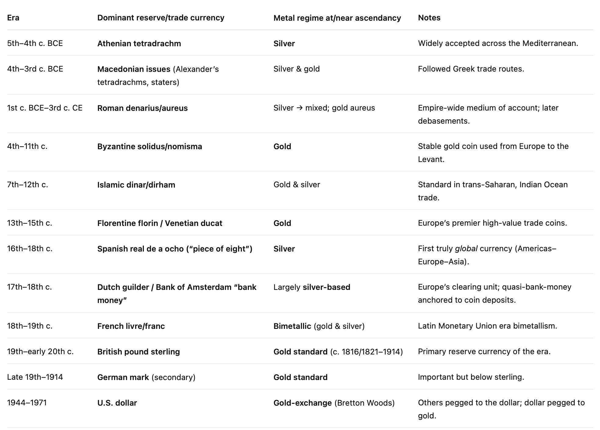 Gold and silver have a much more modest exposure to the risks above. You don’t have to believe me - just look at the history. Since 500 BCE it's mostly been gold and/or silver - and Bitcoin doesn't change that.