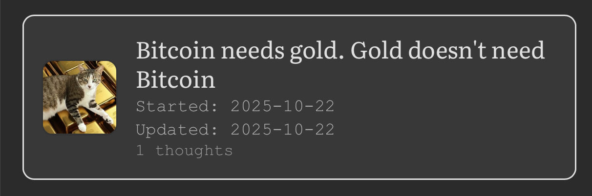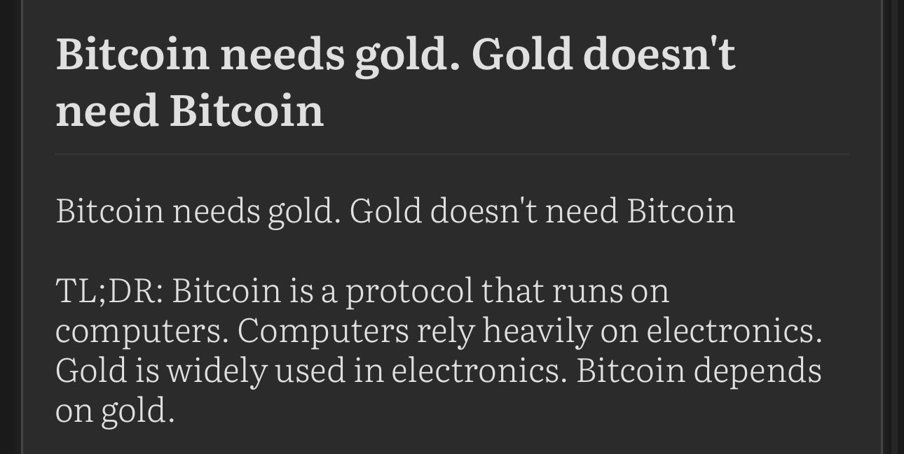 My article on Gold vs Bitcoin, and how Bitcoin needs Gold, but Gold doesn't need Bitcoin: https://illya.sh/threads/bitcoin-needs-gold-gold-doesnt-need-bitcoin.html