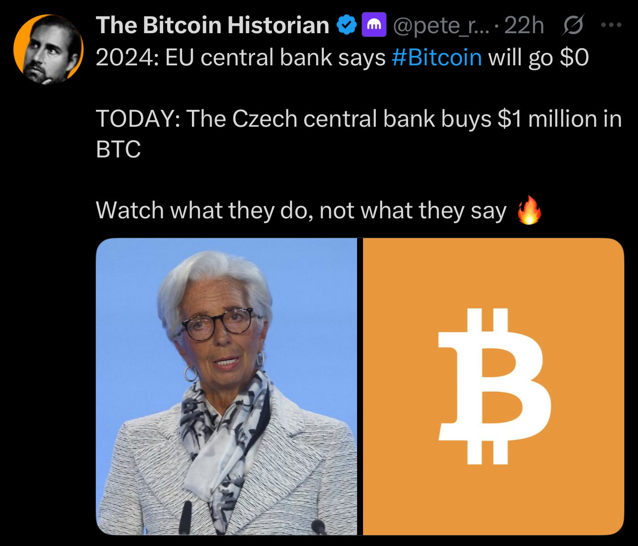 Just wait until Bitcoin hype accounts find out that Czechia has not adapted the Euro, so it's not a part of the Eurozone.