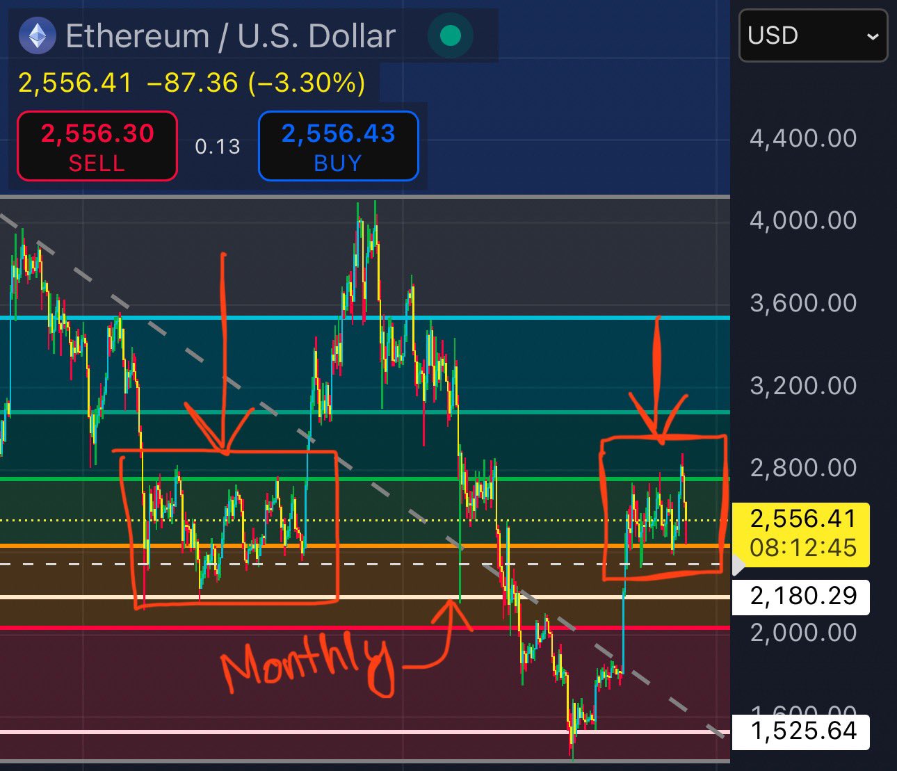 ethereum's price will very likely retrace upwards once it reaches the core monthly support area