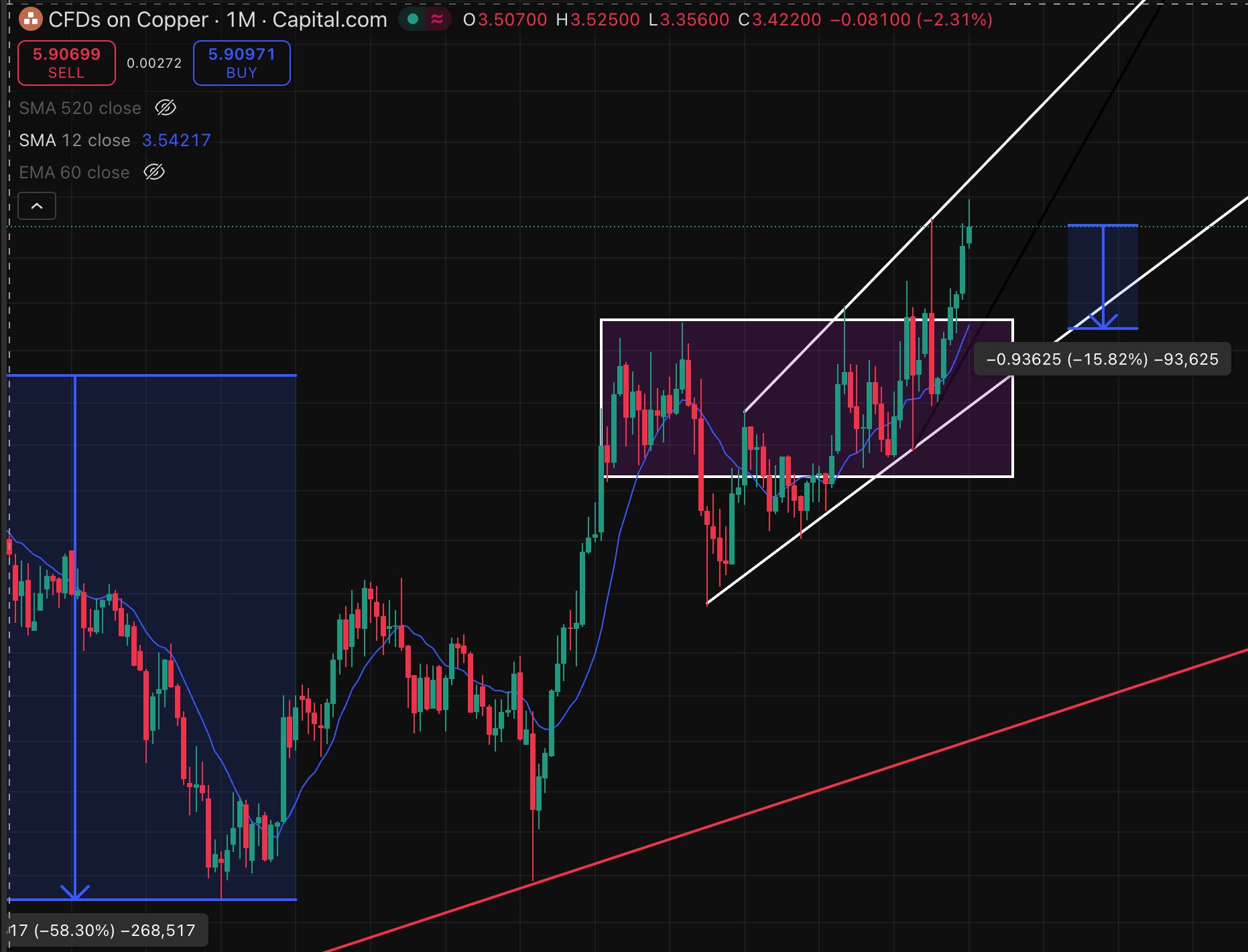Regarding the maximum drawdown from the current price levels (≈$5.90/lb), I don’t believe that copper will correct more than ≈15%, as there it will find a strong support area, and soon after the bottom support trend line from the monthly upwards channel, both of which will exert strong buying pressure. Within 6 months from now, I expect copper’s price to be above the current levels. This a risk-adjusted timeframe in which you should frame the current thesis - so it means that, for the same amount of capital, your investments in copper from today will be yield significantly more than they would in at the prevailing rate in money market funds. Realistically, I think it will happen much sooner than 6 months.