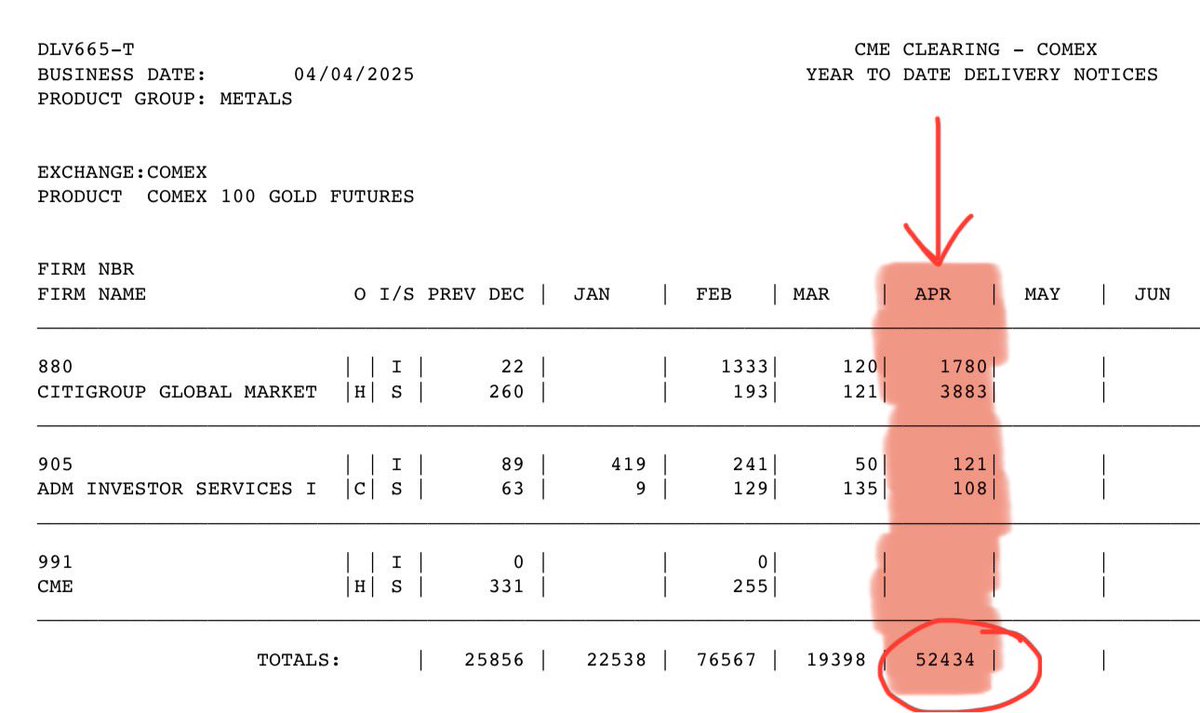 In the first 4 days of April 2025, over 52K COMEX 100 Gold Futures contracts have been requested for physical delivery