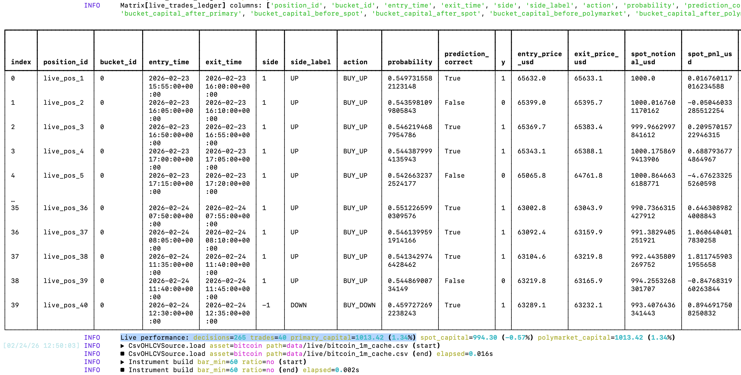 I've been running live a tuned model designed to predict Bitcoin's price moves in Polymarket's BTC's 5 minute up or down markets