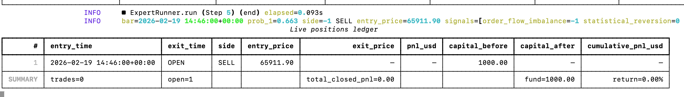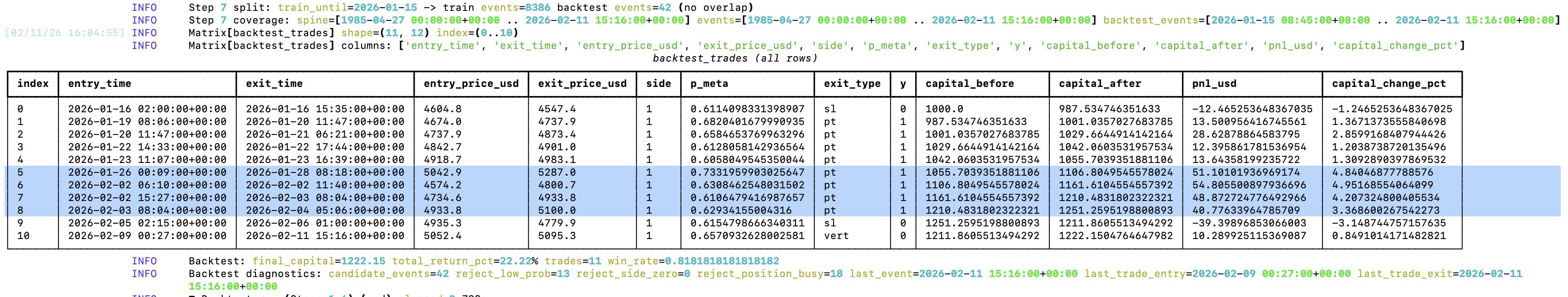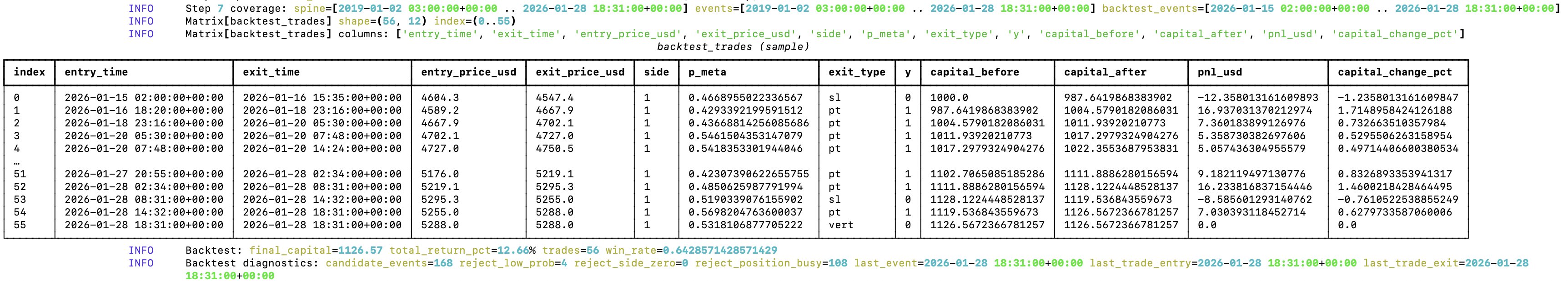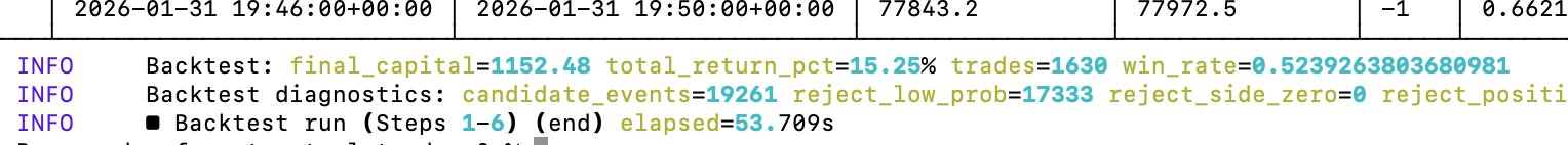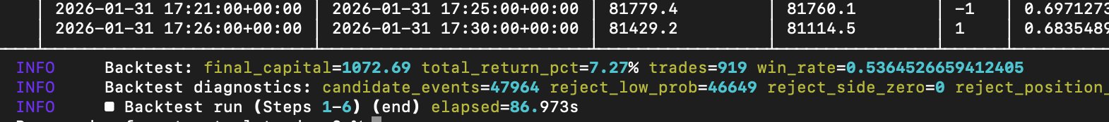 Currently, it's structured to match Polymarket's 5 minute BTC up or down markets, so this model can be used for trading on those markets. In this setup, the return is binary -- you either almost double or lose the whole position (assuming an entry as within a small delta of the market open). But this model can also be easily adapted to long/short futures positions with more flexibility on entry or exit times — it would require adapting the labeler and the backtest configuration (namely the cost model and position sizing).