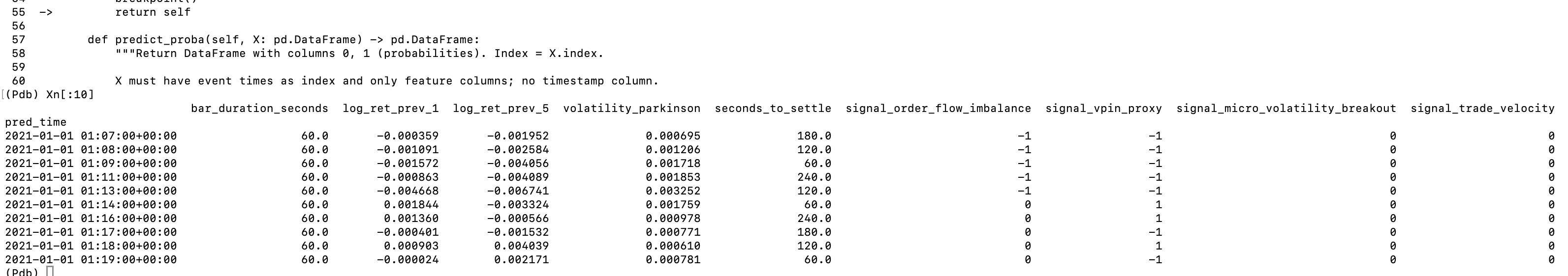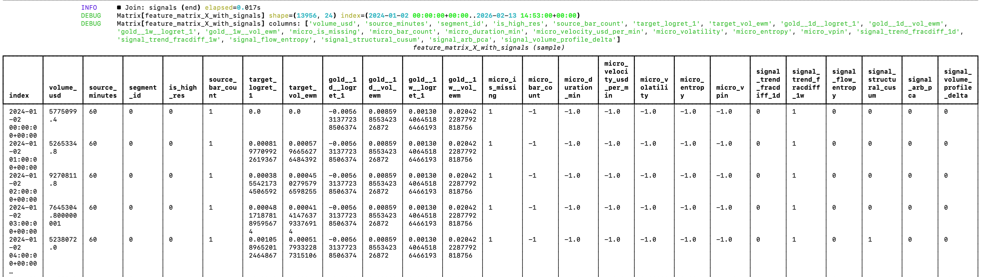 I’ll also make the labeler configurable, so that you can use the same set of features for different types of predictions. For example, you could have the “unconstrained” standard deviation labelling in the sense hat you can enter and exit the position at any time, to constrained logic scenarios such as the ones of Polymarket’s 5-minute price predictions on Bitcoin, where you can only enter a position at specific times, and the resolution happens at specific times (e.g. at the end of every 5th minute of the day, starting from 0).