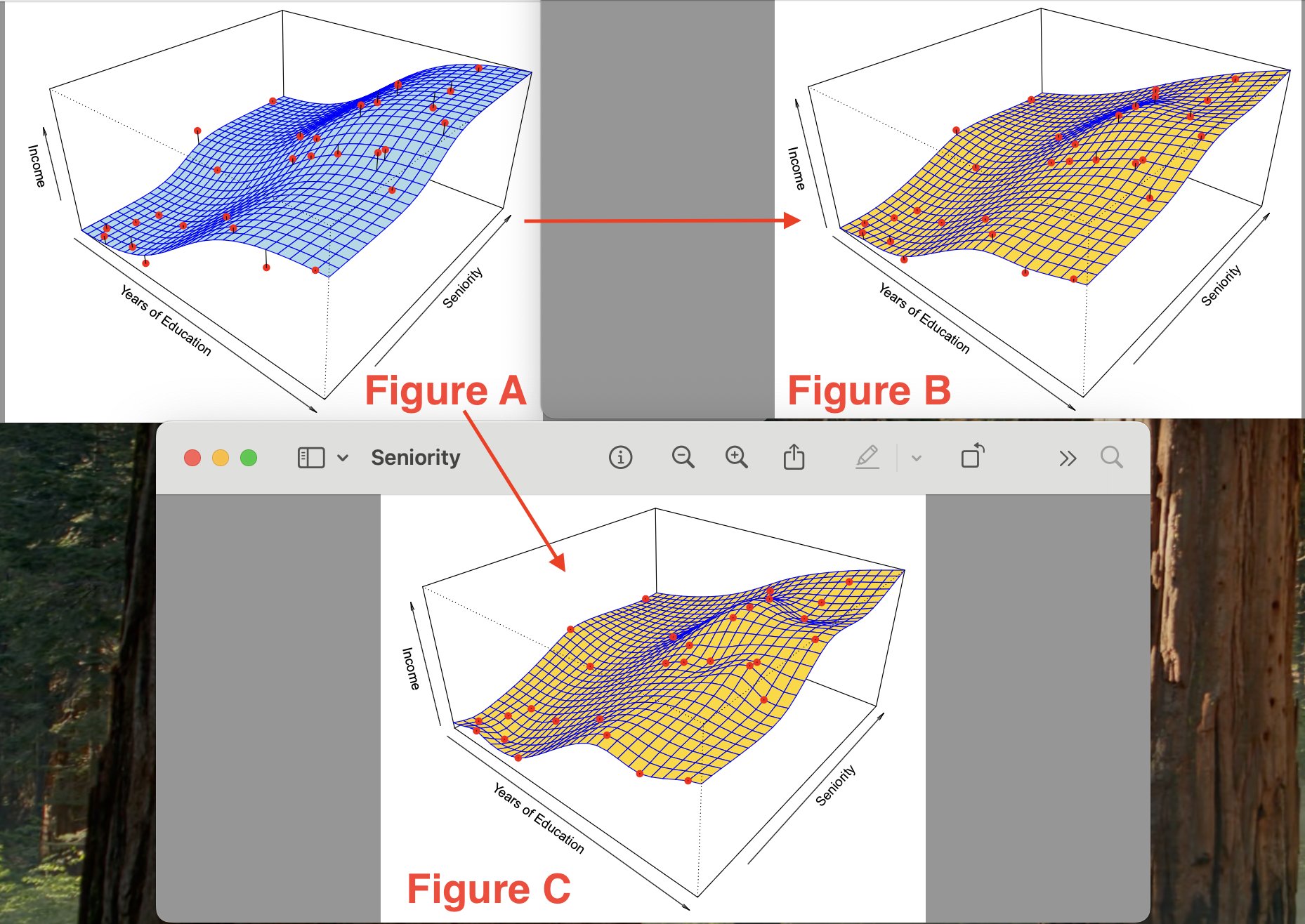 So we are trying to estimate the function whose graph visualization is shown in figure A. In A you see the true underlying function representation. Figures B and C are estimates for the true function shown in Figure A. In Figures B and C, a thin-plate spline fit is used to approximate the function shown in A. To obtain the function/model in Figure C, a smaller level of smoothness was used than in Figure B (less smoothing means more flexibility/effective degrees of freedom).