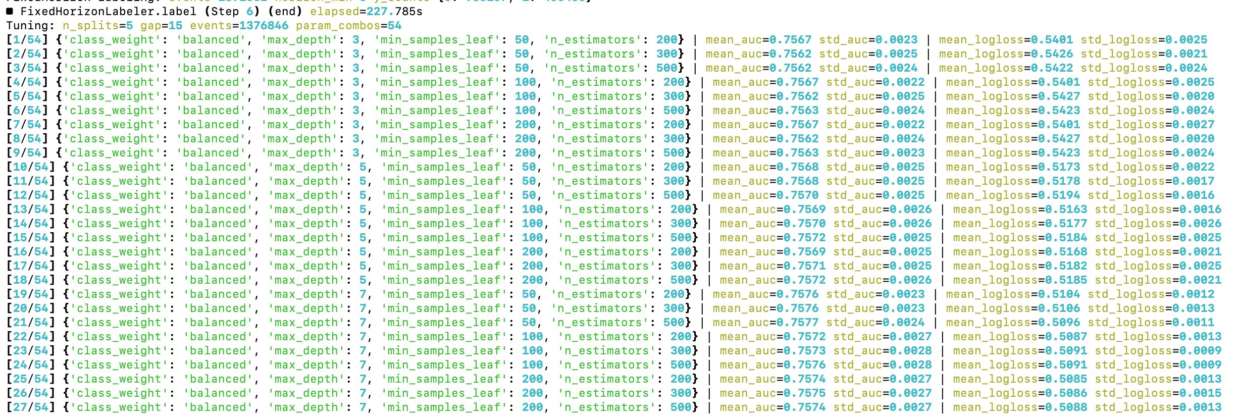 The first version of the model factory relied on features derived from 1 minute OCHLV data for Bitcoin. I focused on setting up a multi-model pipeline, and generalize it into a configurable DSL-like experience. I also focused on avoiding a big part of overfitting/looking forward and doing the first level of parameter optimization. I was able to obtain a small edge (≈0.54 win rate), and short-run live tests showed the model to be profitable, however I’m not very sure how resilient it is to regime changes, nor I find the computed edge sufficient (the win rate is subject to the error from the models). I also wasn’t expecting to achieve a meaningful edge with just OCHLV data, so I’m integrating limit order book (LOB) data in order to extract price movement predictive patterns from the lower level dynamics that end up determining the price.