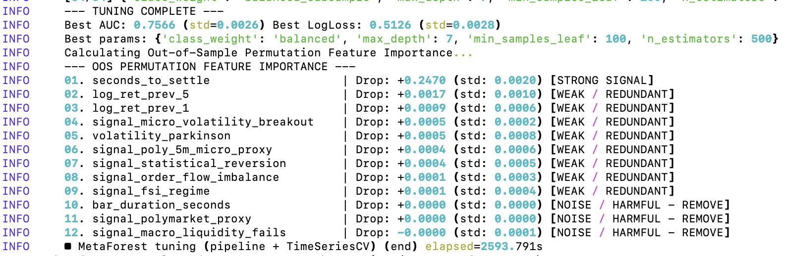 Conclusion: my meta forest — the “seconds_to_settle” feature is basically carrying the entire model 😂 So in its current state, the random forest is training almost entirely on the time of day/time to expiration. The cleanup has started.