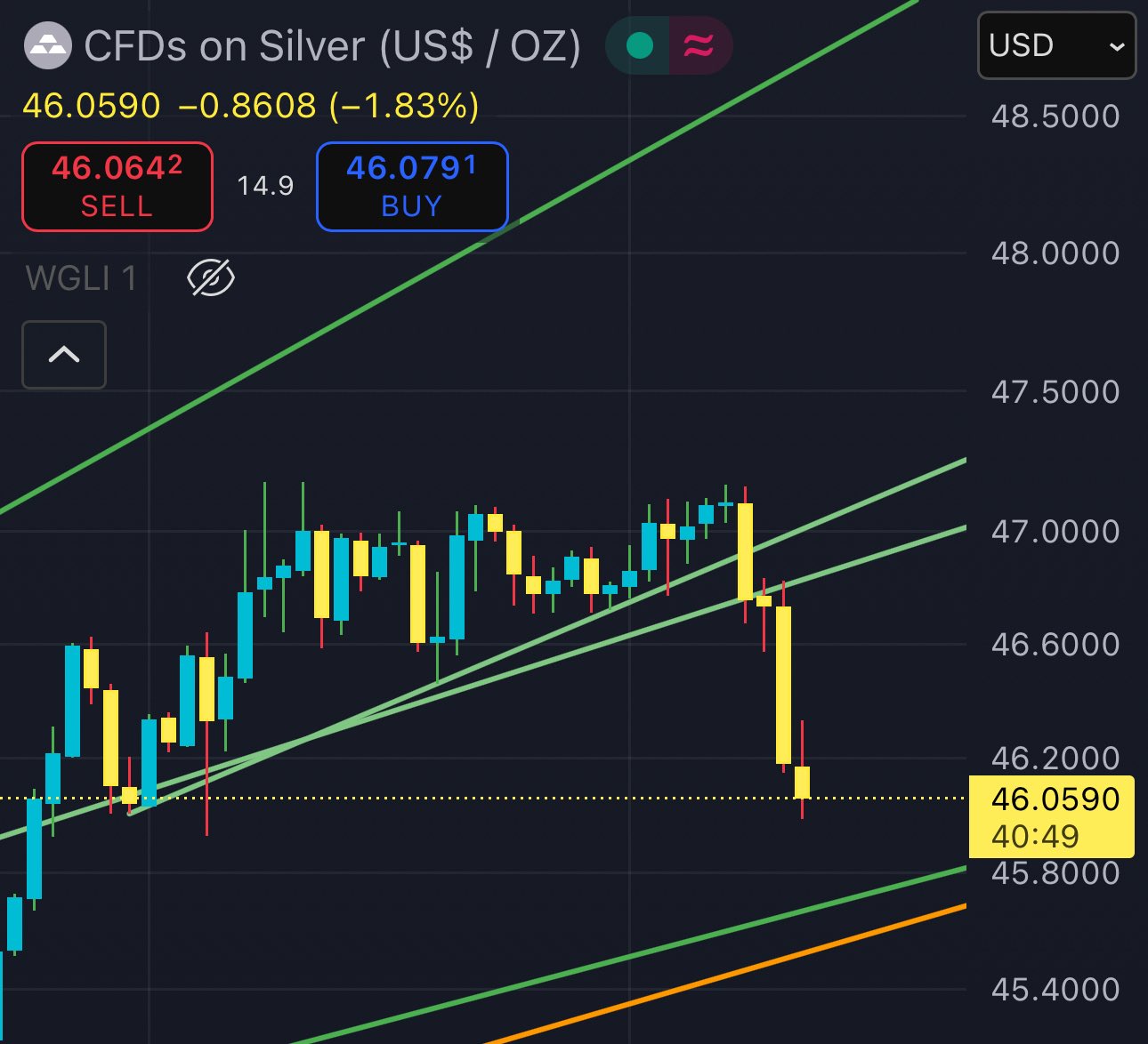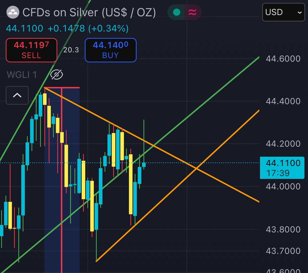 (silver) a breakdown below the bottom orange line will likely push the price further down, at least to ≈$43.35