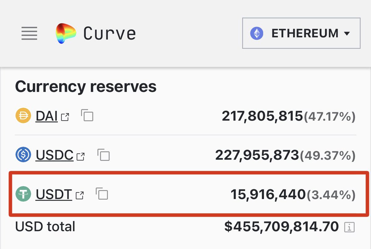 🚨 $USDT reserves at #Curve are almost depleted, with less than 4% of it remaining in the #3pool