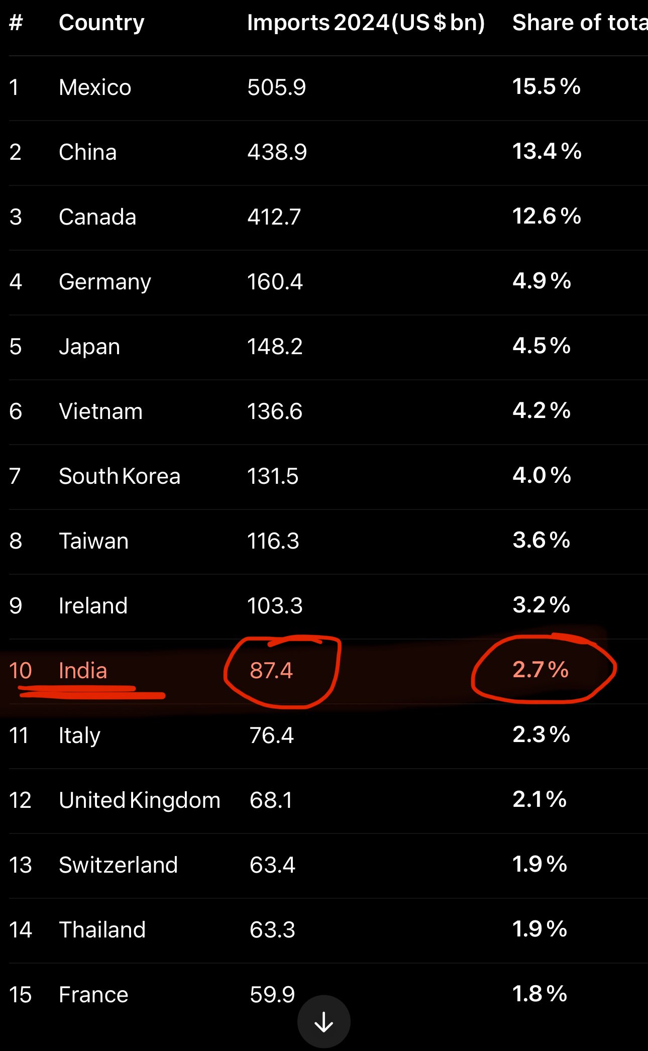 🇺🇸🇮🇳 US imports for India account for mere 2.7% of its total imports - only $87 billion