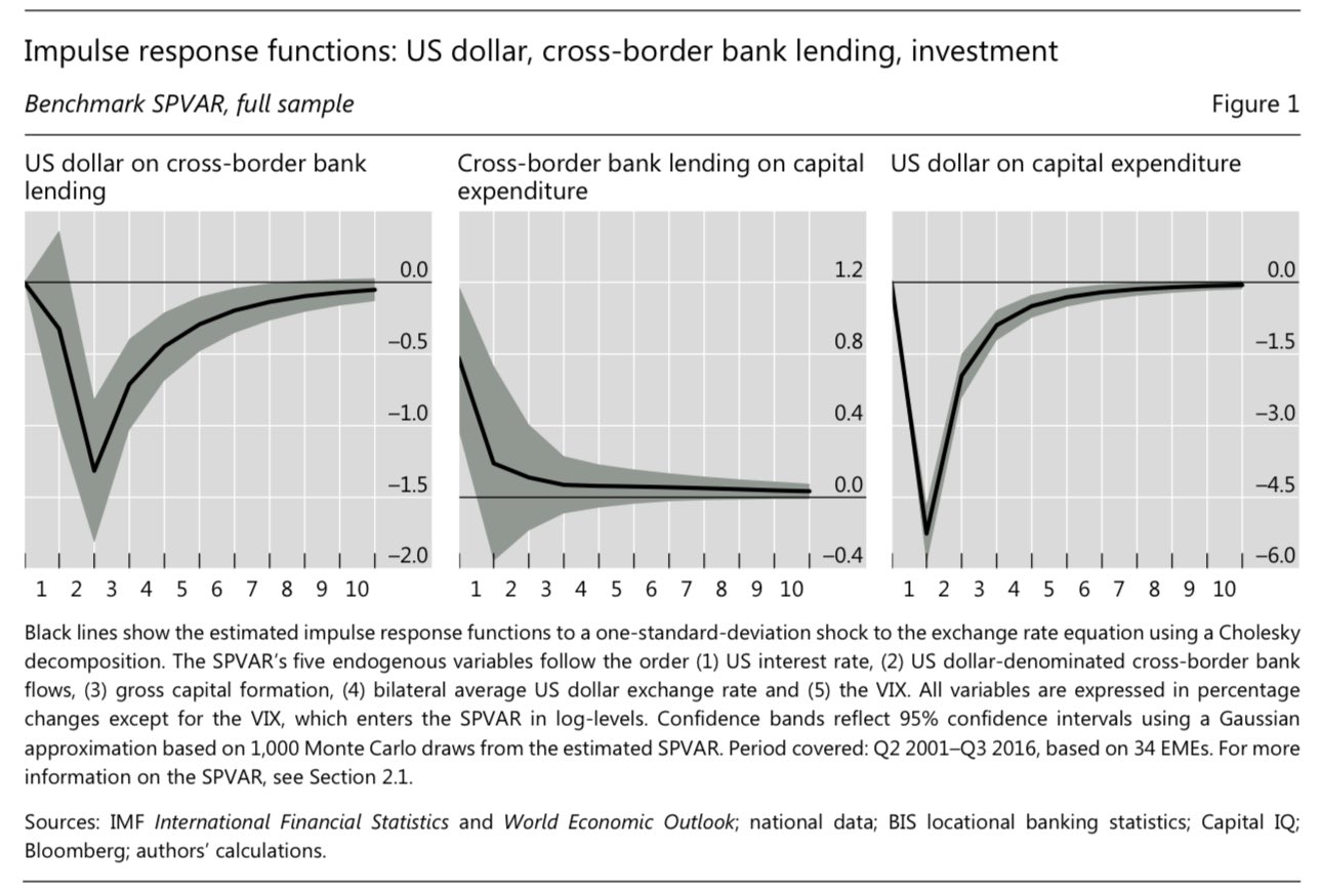 in the SVAR, one standard deviation of US dollar's appreciation leads to a fall in cross-border USD lending. it reaches its bottom after 6 months and then eventually recovers after 2.5 years if no new shocks arrive