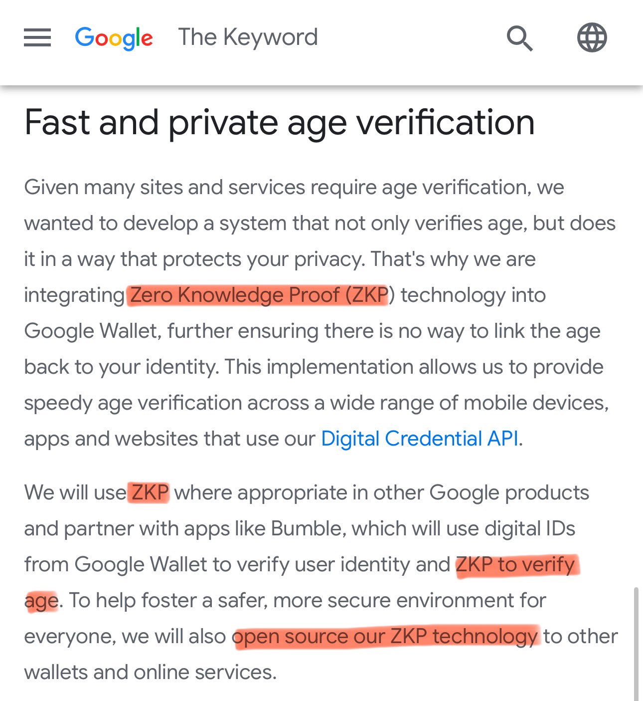 ZKPs will allow you to prove your age to other apps via Google Wallet - e.g. a proof that you are >18