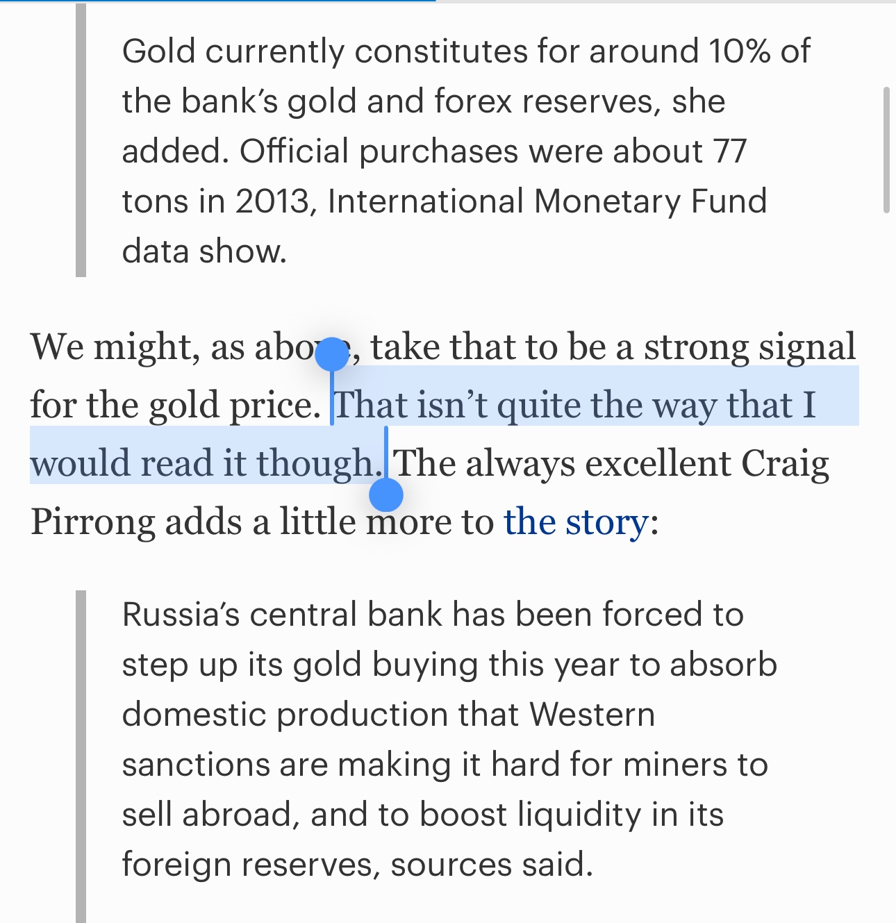 Another thing that the article omits is that a central bank can buy gold without expanding the base monetary base (i.e. "printing" new currency), for example by swapping FX reserves for gold via a single or multi-leg sale.