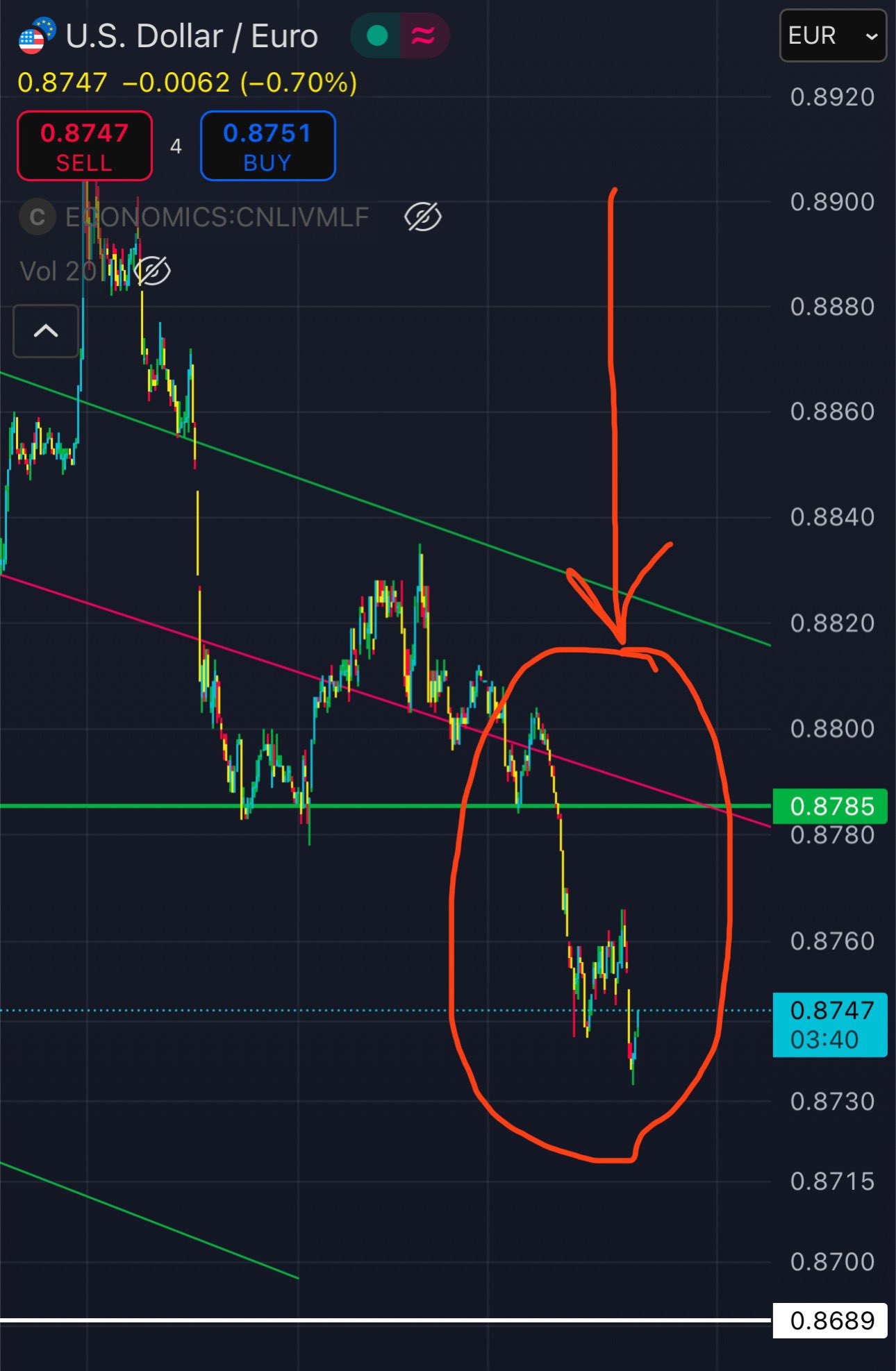 If USD/EUR falls below the pink trend line, it's a fall to โ0.8785